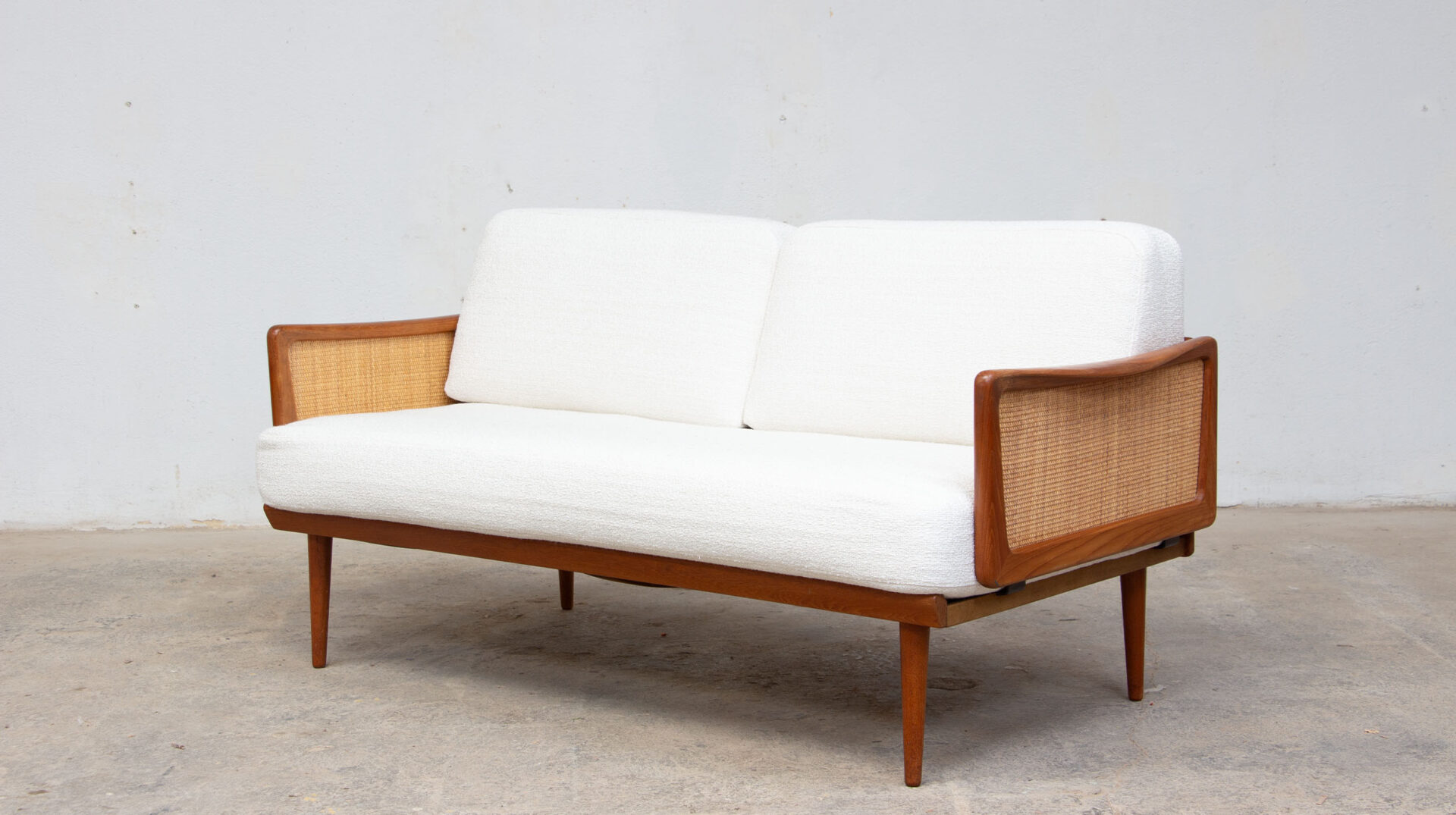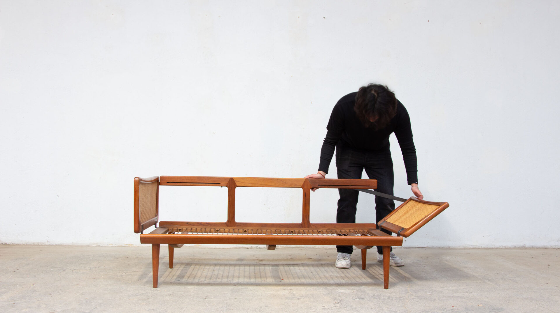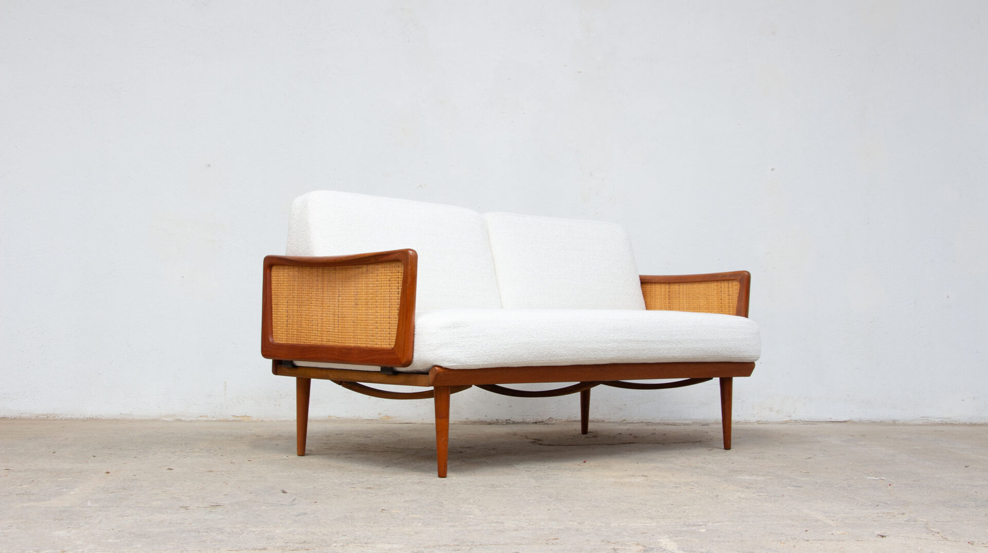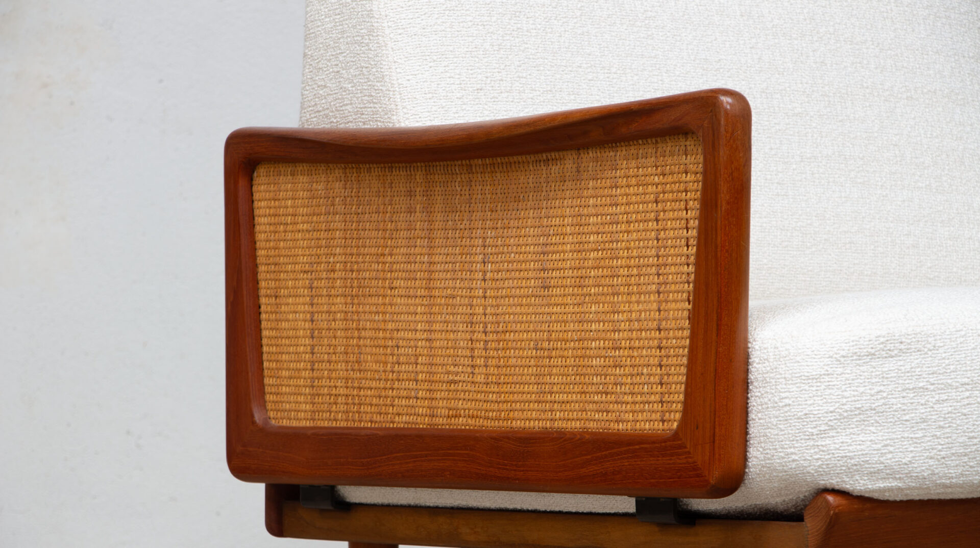 Estampillé de l’éditeur par ses écussons. Structure en en teck massif et cannage en très bon état. Système ingénieux de conversion : les accotoirs se basculent grâce à un bouton en laiton qui débloque une barre coulissante. Ce qui permet d’obtenir un lit de repos ou un lit d’appoint. Ensemble dans un excellent état vintage.