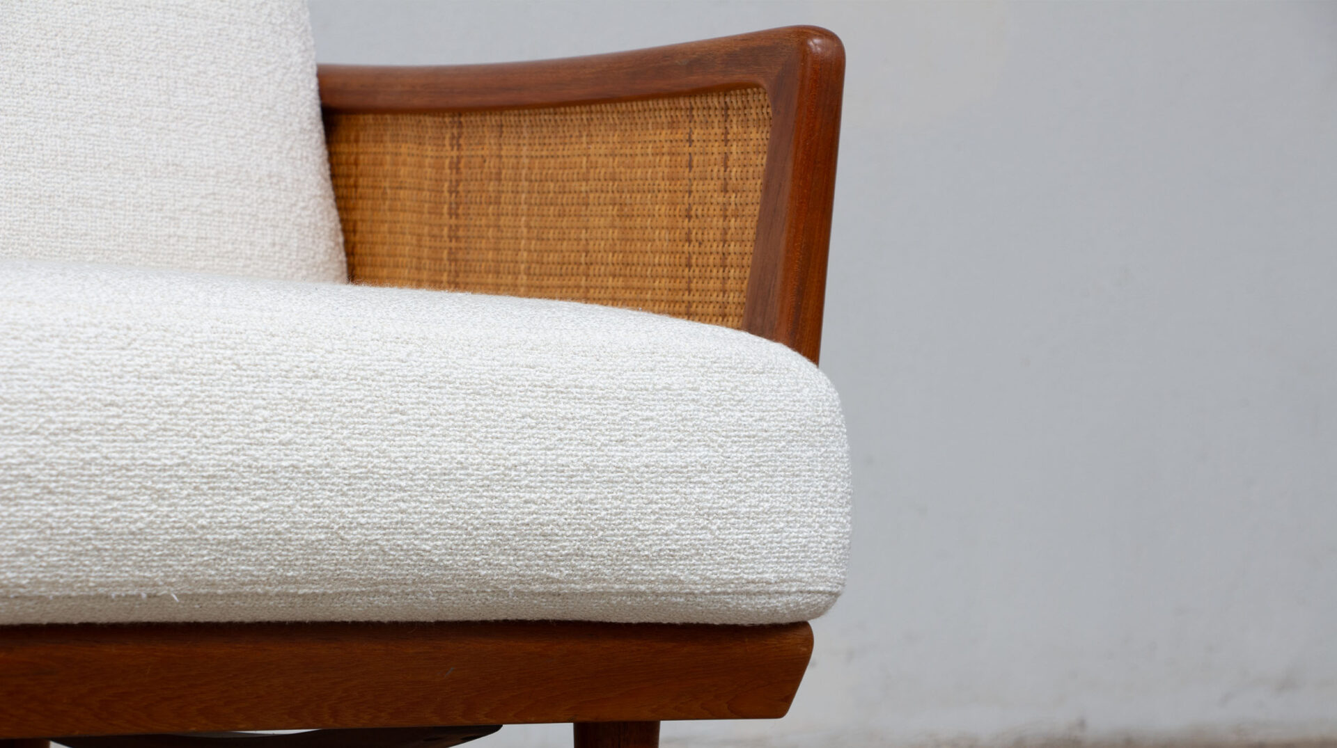 Restauration de la tapisserie récente : tissu bouclette écru de la gamme Alma de la maison Francaise Casamance. Le matelas et les coussins à ressorts sont d’origine mais restaurés complètement.