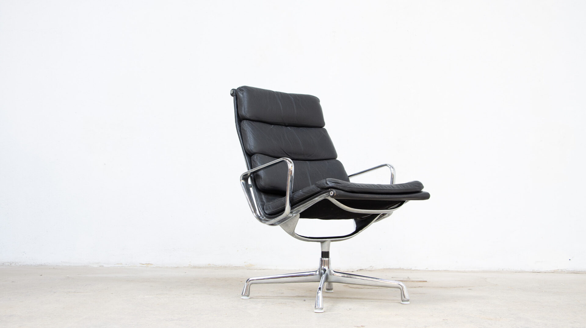 Fauteuil lounge vintage de bureau Soft pad EA 216 en cuir noir du couple de designers Américains Ray and Charles EAMES. Après avoir travaillé sur la fibre de verre, les époux Eames ont participé au développement de l’utilisation de l’aluminium dans le mobilier.