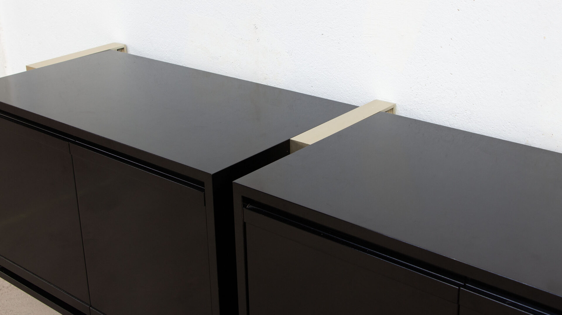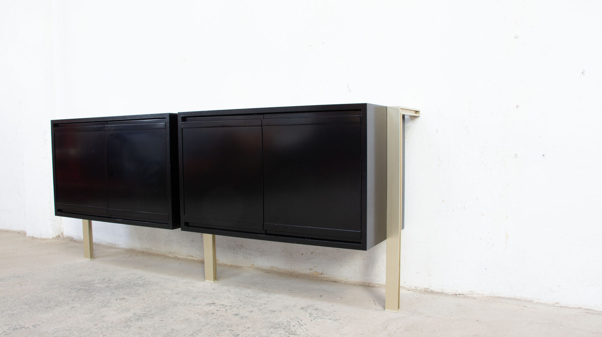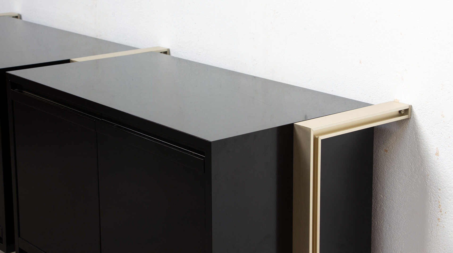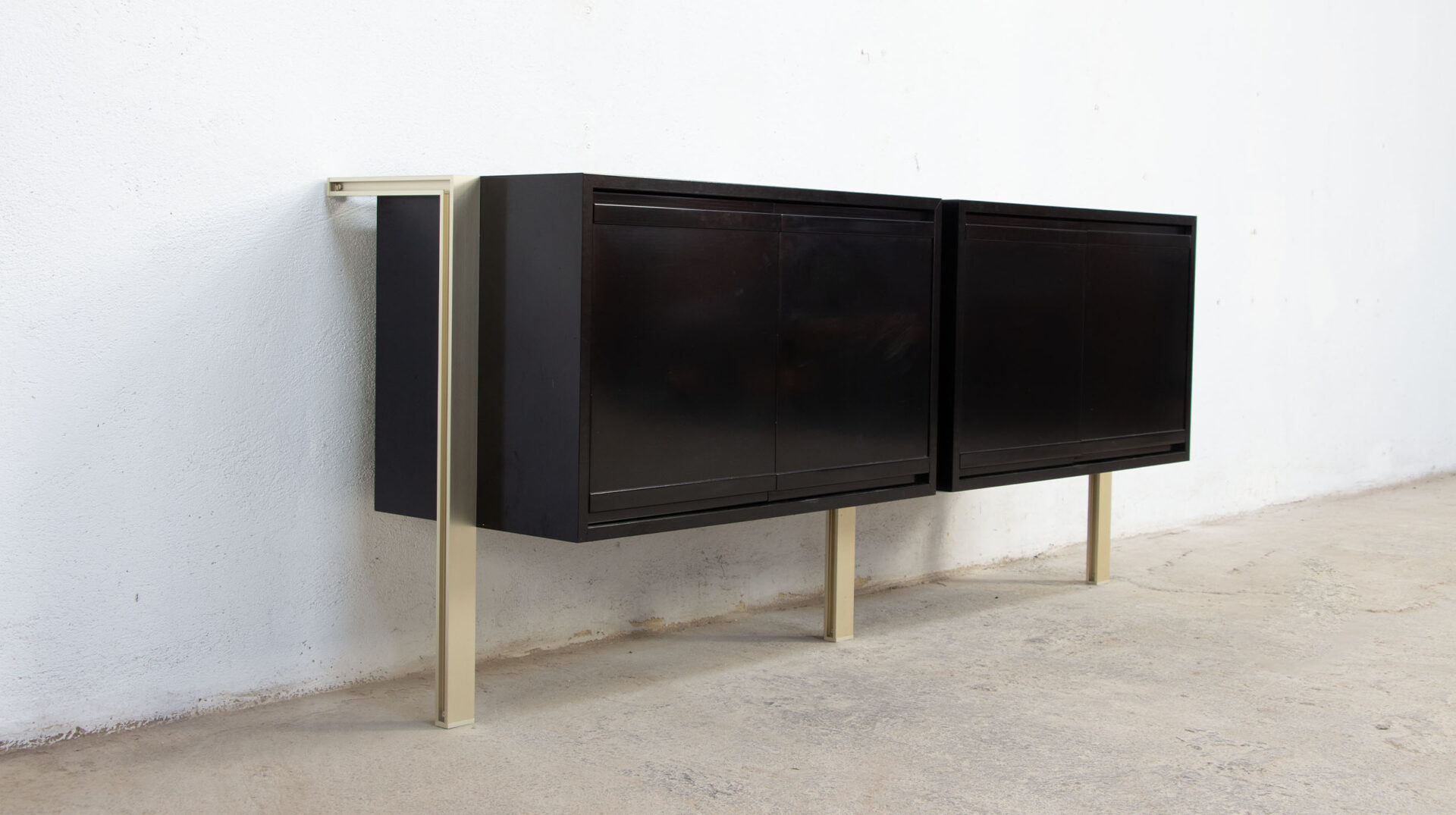 Enfilade vintage de Michel Ducaroy pour Ligne Roset dans les années 70. Modèle d’origine rare laqué noir, avec ses pieds en aluminium doré suspendus au mur. Les enfilades de cette série ML 80 de Ligne Roset étaient souvent proposées avec des pieds autoportants.