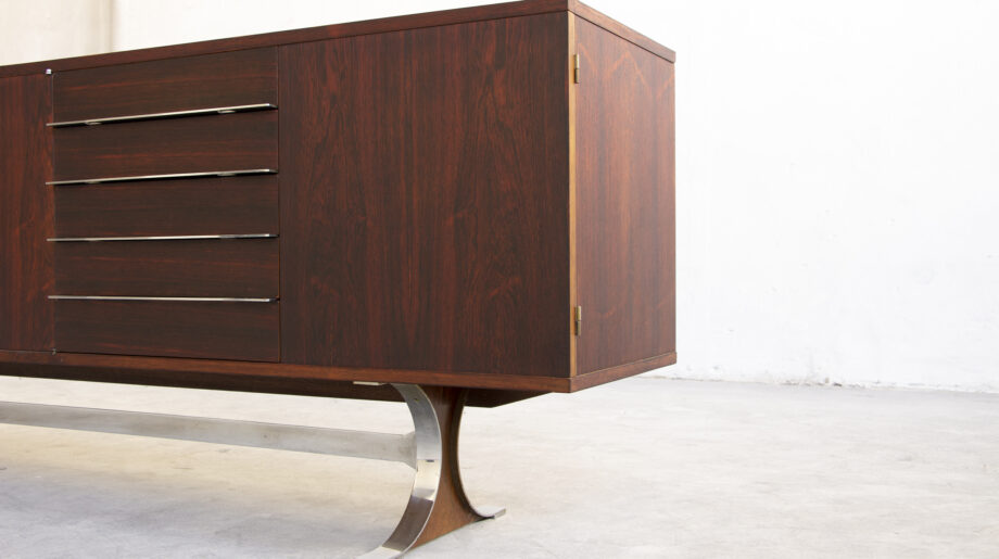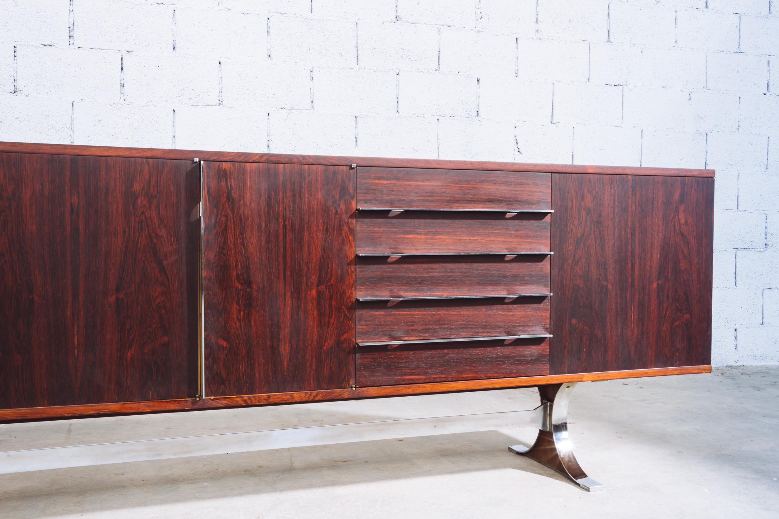 Enfilade des années 60 du designer français René Jean Caillette (prix René Gabriel 1952), modèle « Sylvie » éditée par Georges Charron en palissandre de Rio et acier inoxydable. Beau choix des feuilles par son veinage et sa couleur. Intérieur en citronnier. Possédant 4 tiroirs et 3 portes battantes dont une sans poignée en « push and pull » les poignées sont en laiton massif chromées. Piétement chromé courbé avec incrustation palissandre de rio. Etagères présentes dans chaque partie. Fabrication luxueuse par ses matériaux nobles et son design. Ensemble en très bon état vintage. Meuble d’exception.
