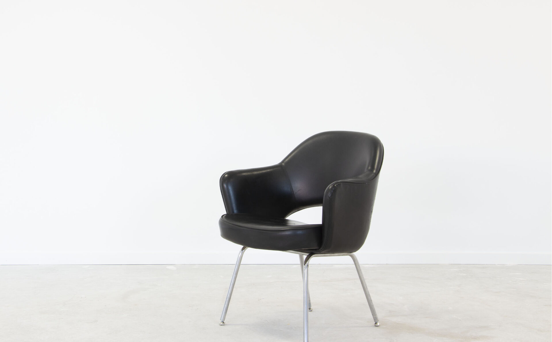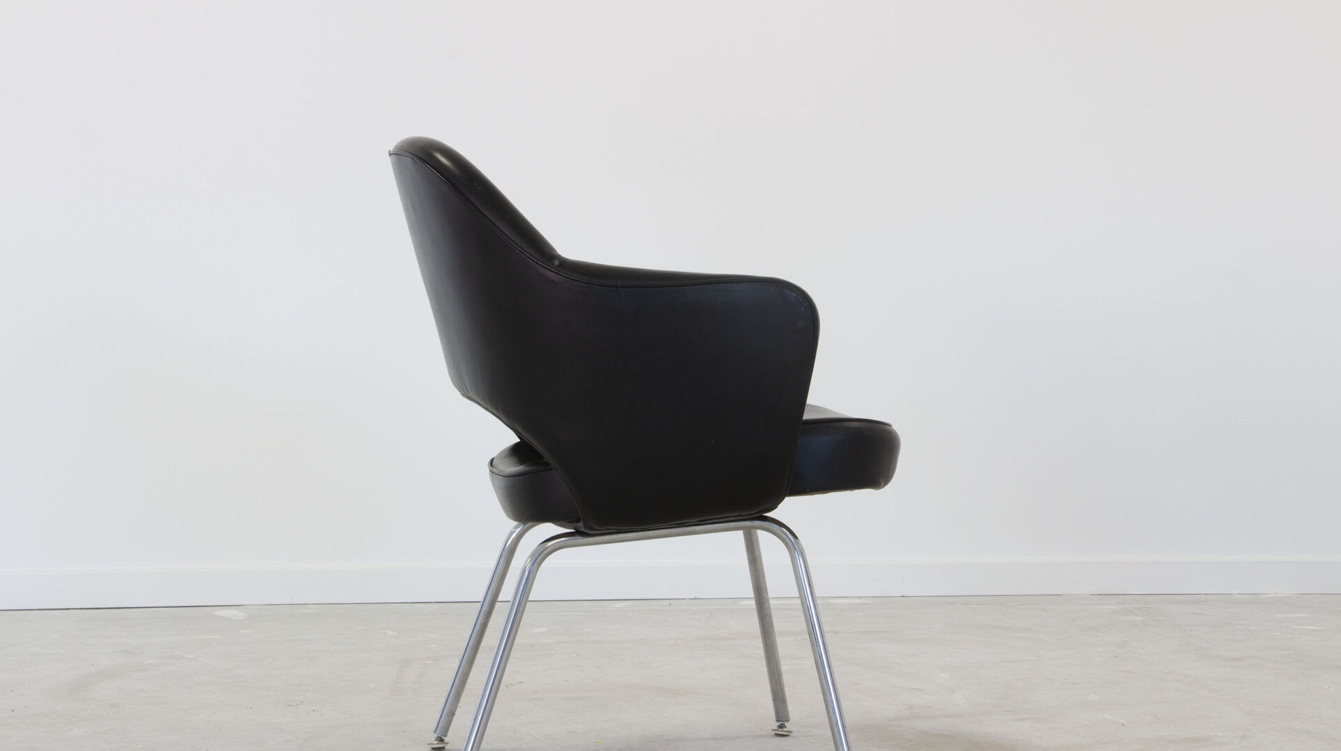 Fauteuil Conférence Eero Saarinen des années 60 édition Knoll. Simili cuir noir, mousse sur structure en fibre. Piètement métallique chromé. Les embouts de pieds sont neufs et de marque Knoll. H82 Hassise 46 P 49 L47,5