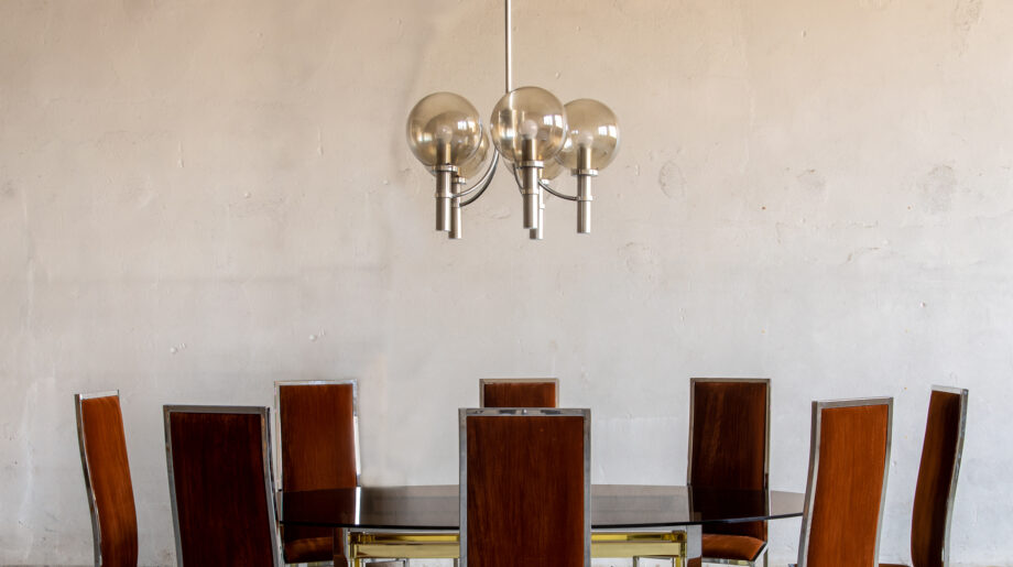 Grand Lustre des années 70 qui rappelle le travail d’Hans Agne Jakobsson avec ses grands globes en verre soufflé fumé.