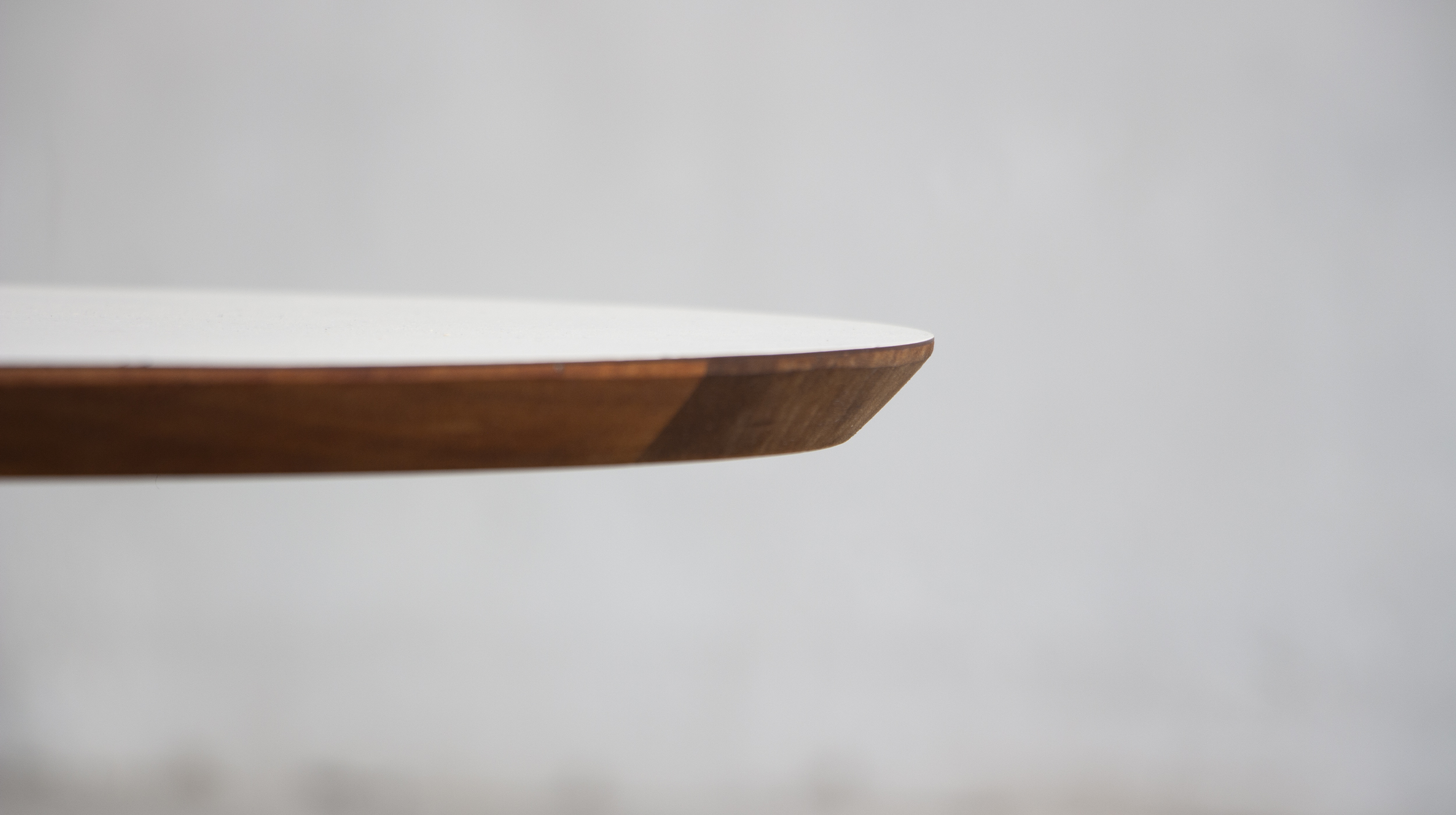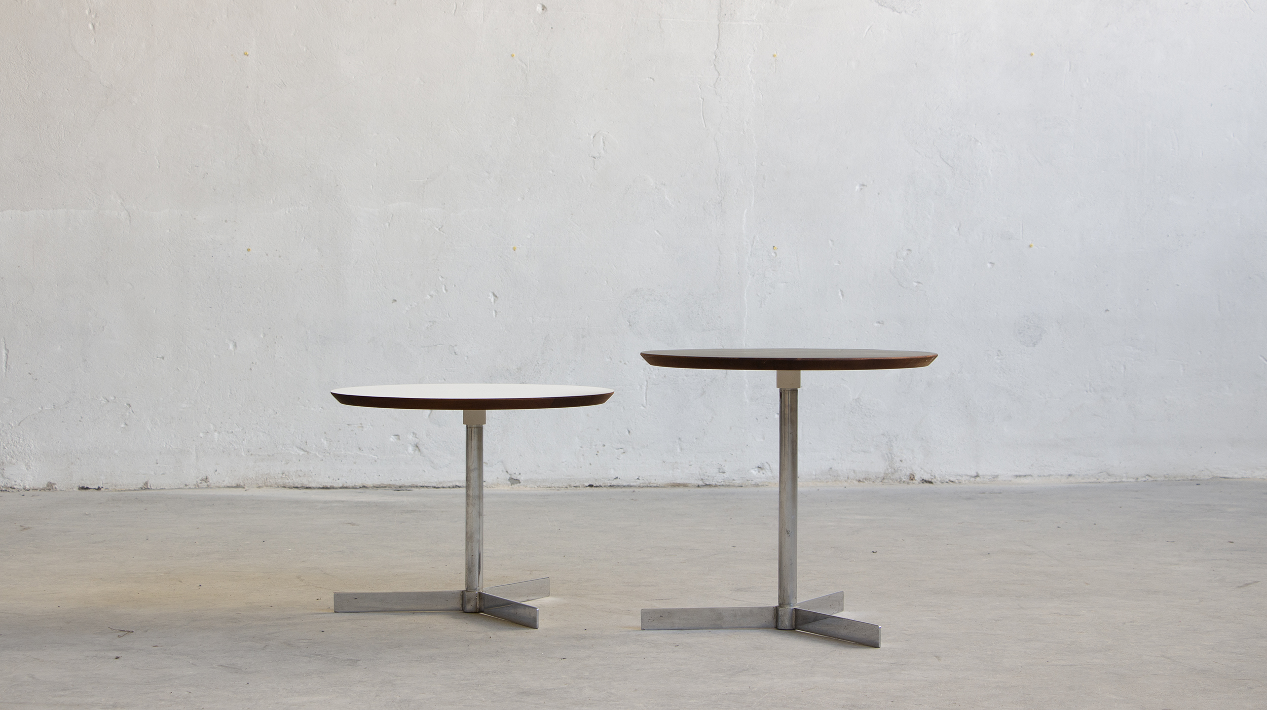 Celles ci sont composées d’un plateau rond stratifié blanc ou noir avec des alèses en acajou massif taillées en bias. Posé sur un tube rond en acier chromé avec 3 pieds en hélice rectangulaire.