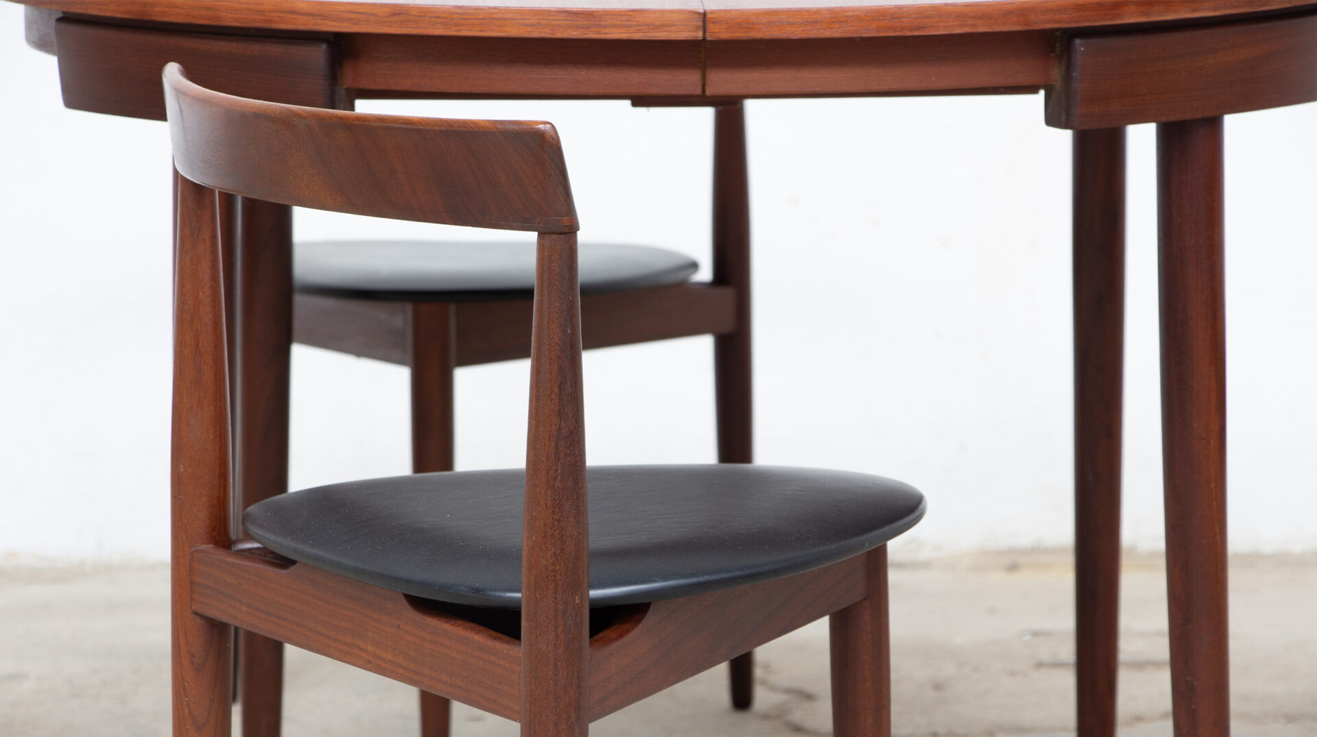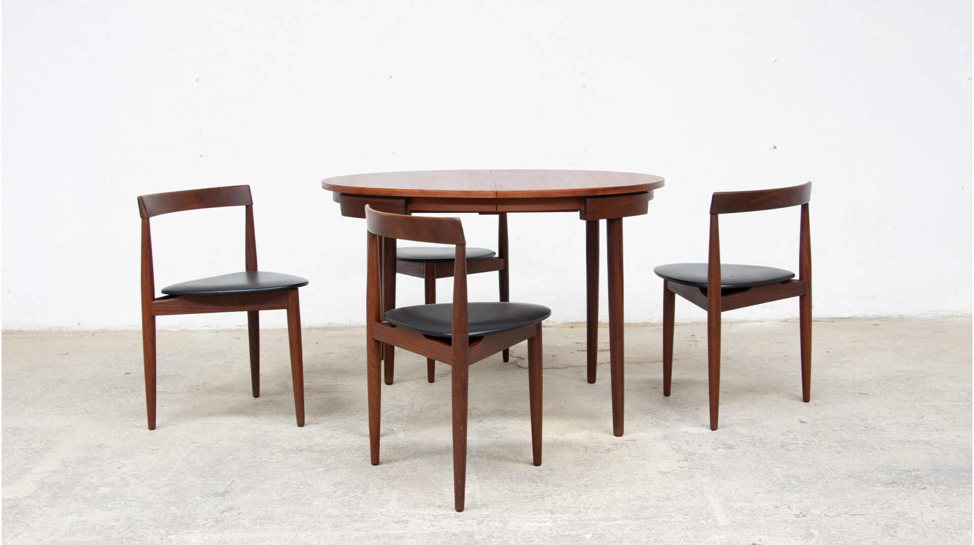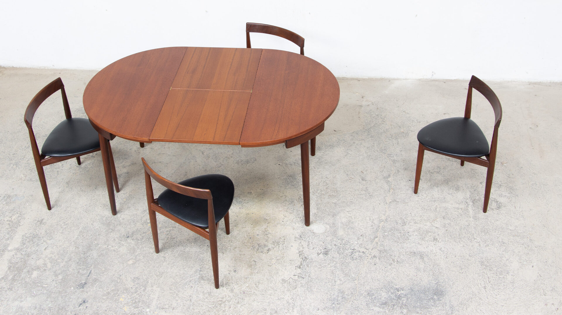 Table Danoise iconique des années 60 avec ses 4 chaises tripodes par Hans Olsen pour l’éditeur Danois Frem Rojle en teck.