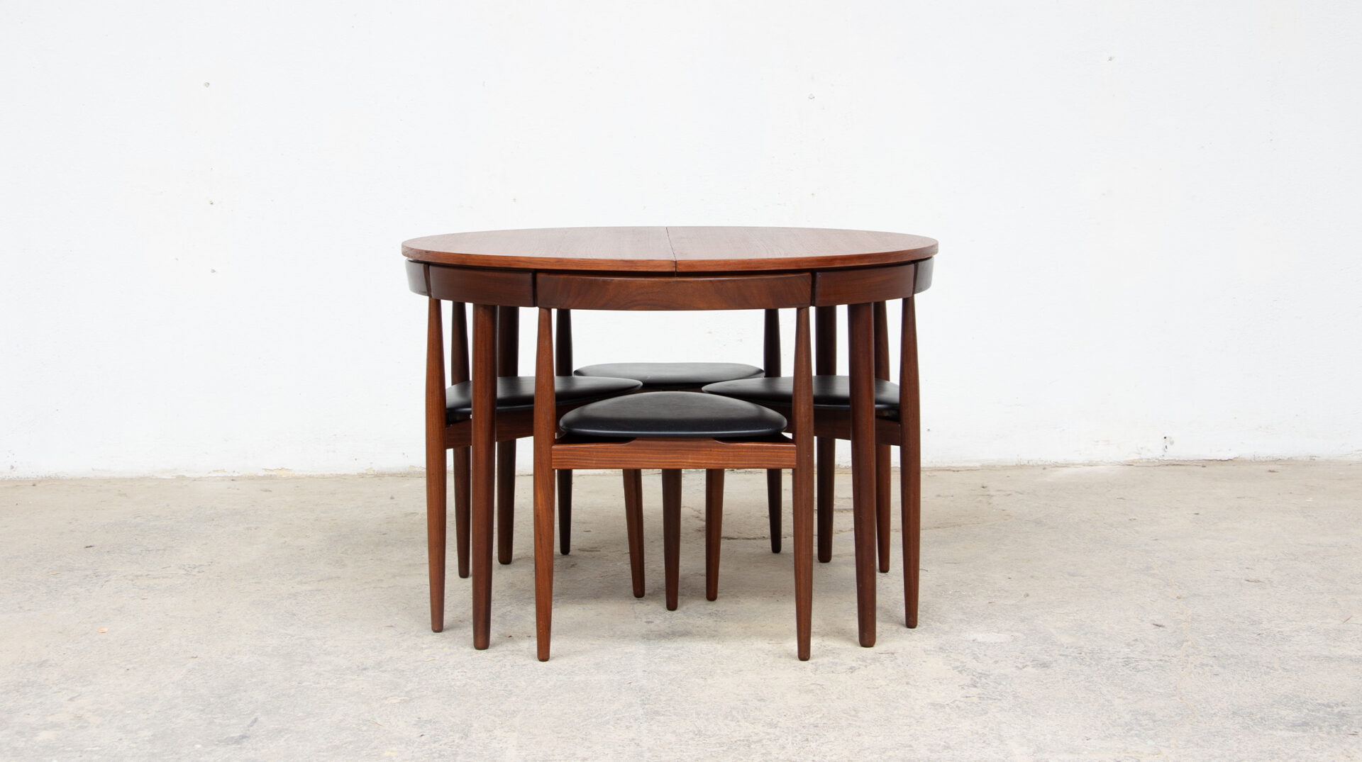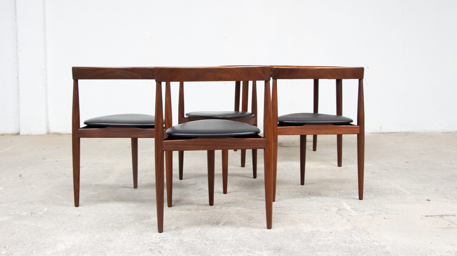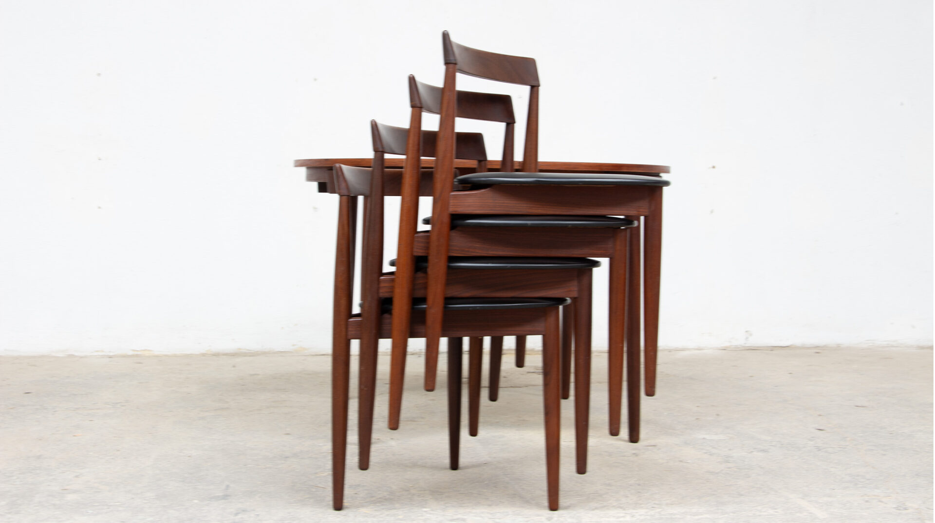 Table Danoise iconique des années 60 avec ses 4 chaises tripodes par Hans Olsen pour l’éditeur Danois Frem Rojle en teck.